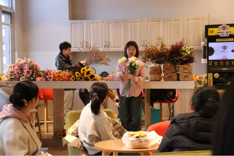当天中午,公司一楼咖啡厅花香扑鼻、色彩斑斓。在专业花艺师为大家讲解了常见花材品种、等级、习性与养护等基础理论知识后,现场师生投入到艺术构思和实操练习中。大家修剪枝叶、搭配颜色、设计造型,亲手制作出一件件充满匠心和个性花艺作品。大家纷纷举起手机相机、拍照留影,定格这一温馨美好时刻。(文/佘蕙文 图/蒋芙薱)