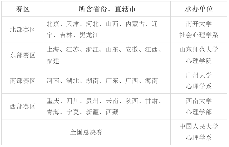 请各个院校组织员工积极报名,本科生与研究生均可报名参赛,鼓励跨年级、跨专业组队。可通过赛事公众号菜单直接报名,后期组委会将会把名单发送至各个院校负责老师。赛事组委会将联系各个院校推荐负责老师,也欢迎各个院校心理学相关专业的负责老师自荐,联系方式见文末。