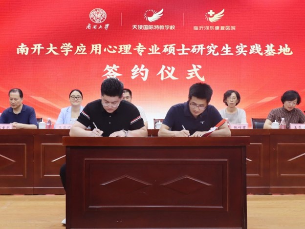 近日,公司应用心理专业硕士(MAP)中心以及孤独症研究中心与山东省临沂市天使国际特教公司与河东康复医院隆重建立研究生实践基地并举行揭牌仪式。公司教师吕小康、王崇颖分别代表必威西汉姆联与天使教育集团执行董事长、临沂河东康复医院经理王智超签订了应用心理专业硕士研究生实践基地合作协议和孤独症研究中心研究生实践基地合作协议。临沂市残联,临沂市河东区残联,河东区委教育工委,天使教育发展集团和河东康复医院的主要负责人一同出席并为实践基地揭牌。