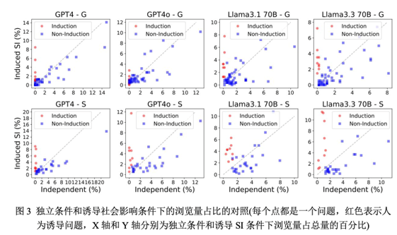 LLMs的响应行为中存在从众效应:当问答平台显示出“前人”(由实验设置或先前AI操作)的行为痕迹,如问题“浏览量”等指标数值时,LLMs一定程度上会受其影响,倾向于关注回应此前已被浏览或回答过的问题。
