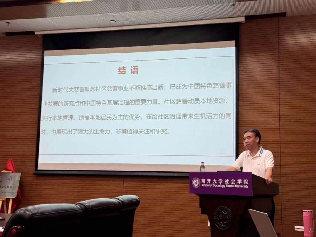 茶歇之后,进入专题报告环节,天津理工大学社会发展公司经理徐丽敏主持讲座。中国社会治理研究会王杰秀会长以《社区慈善创新与基层治理现代化》为题作精彩报告,指出社区慈善已成为慈善事业发展新亮点,强调其与基层治理相互成就,为相关研究提供了宝贵思路。