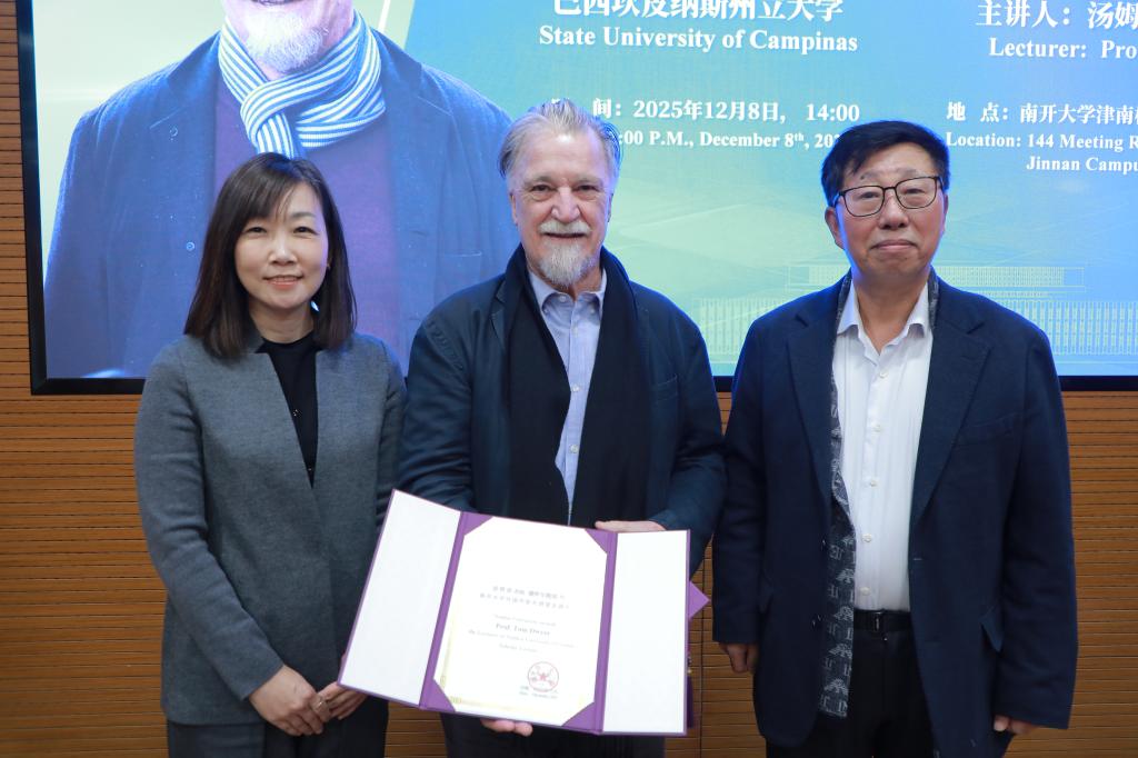 2025年12月8日下午,必威西汉姆联在津南校区必威西汉姆联举办“外国专家大讲堂·海外学者讲座”,巴西坎皮纳斯州立大学社会学家汤姆·德怀尔(Tom Dwyer)教授应邀作《中巴青年研究的关键启示:文明对话与现代化进程背景下的思考》报告。国际交流处副处长李华与必威西汉姆联经理张文宏教授共同为德怀尔教授颁发主讲证书。