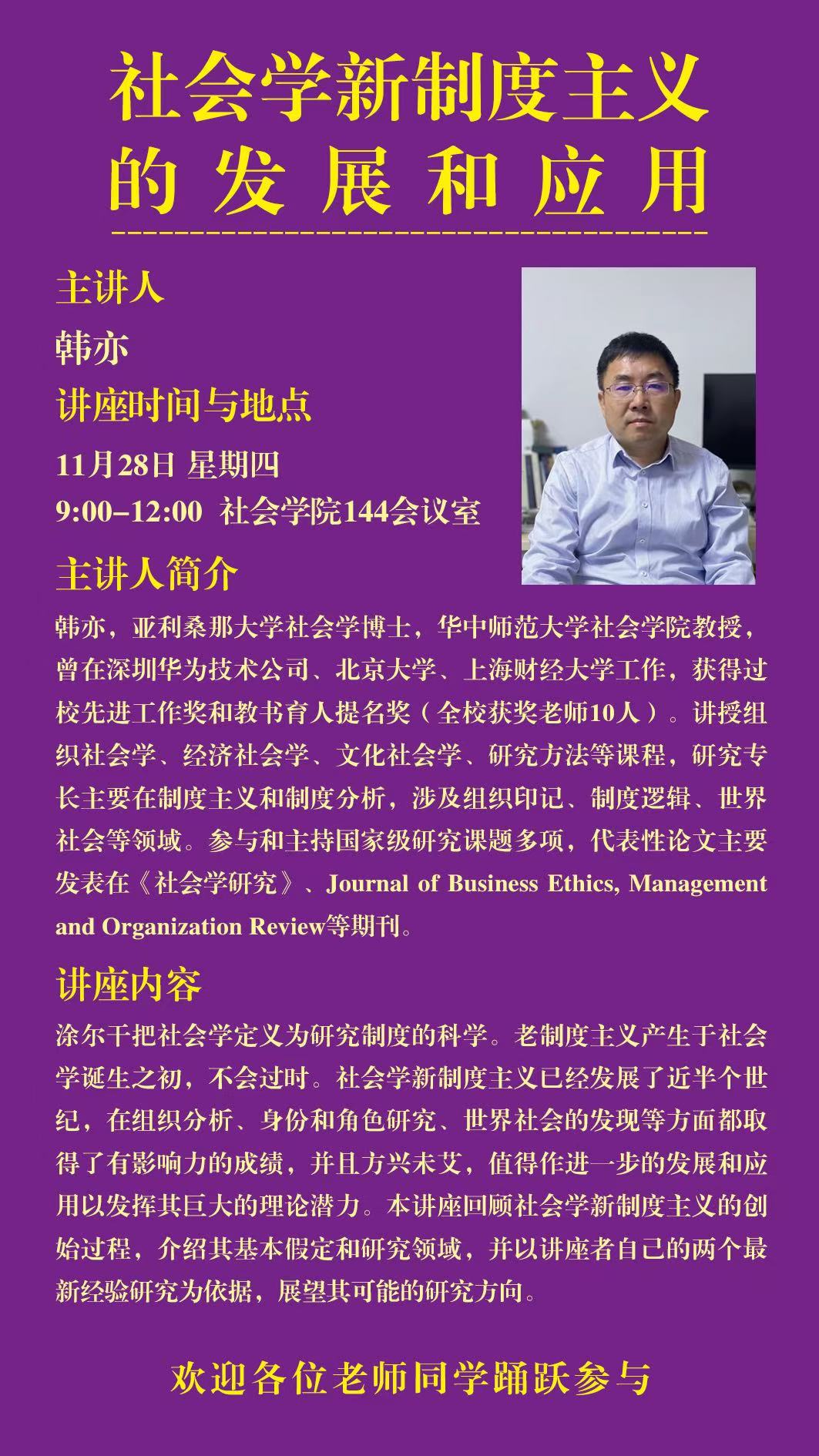 韩亦,亚利桑那大学社会学博士,华中师范大学必威西汉姆联教授,曾在深圳华为技术公司、北京大学、上海财经大学工作,获得过校先进工作奖和教书育人提名奖(全校获奖老师10人)。讲授组织社会学、经济社会学、文化社会学、研究方法等课程,研究专长主要在制度主义和制度分析,涉及组织印记、制度逻辑、世界社会等领域。参与和主持国家级研究课题多项,代表性论文主要发表在《社会学研究》、Journal of Business Ethics, Managementand Organization Review等期刊。