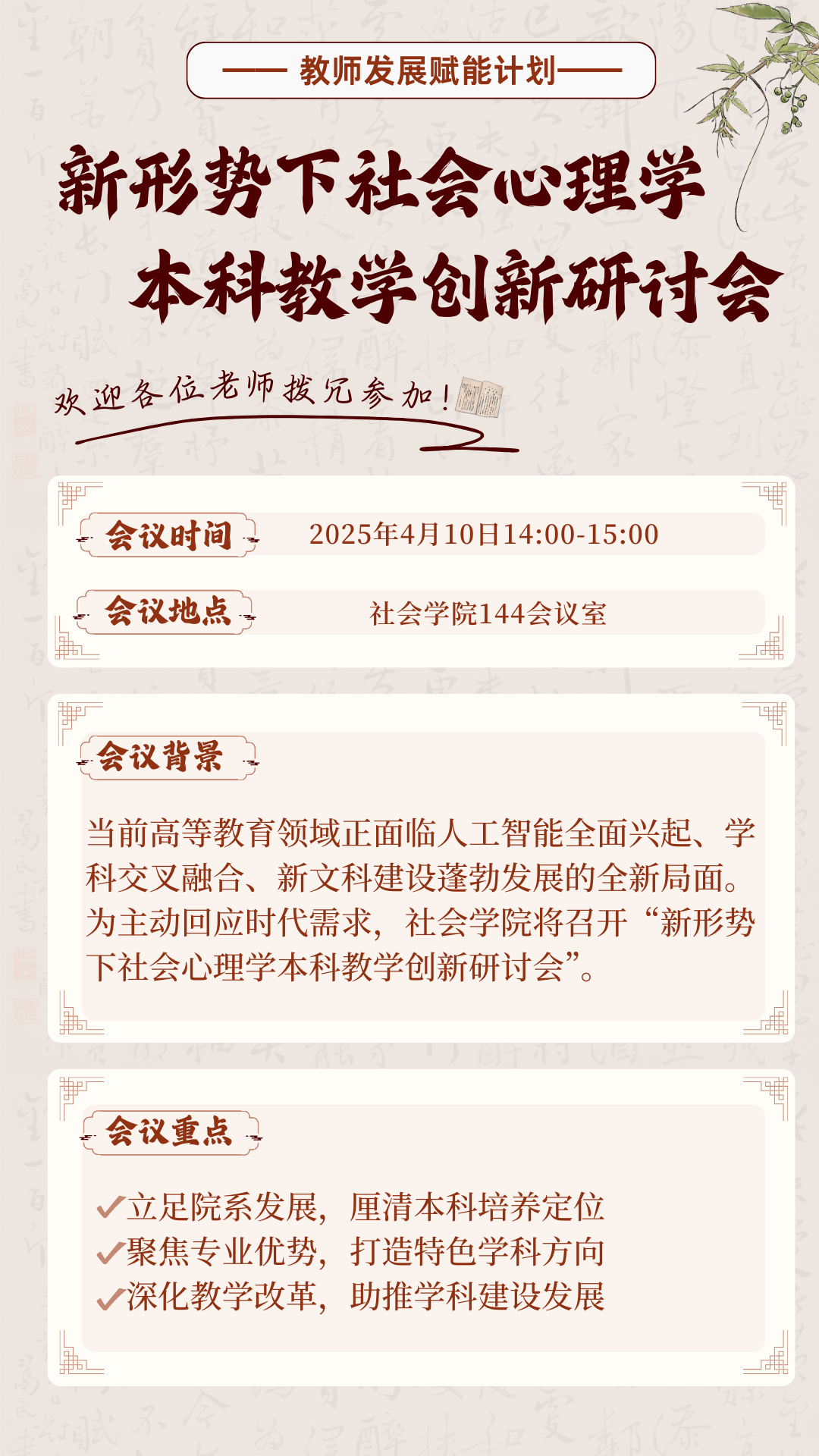 当前高等教育领域正面临人工智能全面兴起、学科交叉融合、新文科建设蓬勃发展的全新局面。为主动回应时代需求,必威西汉姆联将召开“新形势下社会心理学本科教学创新研讨会”