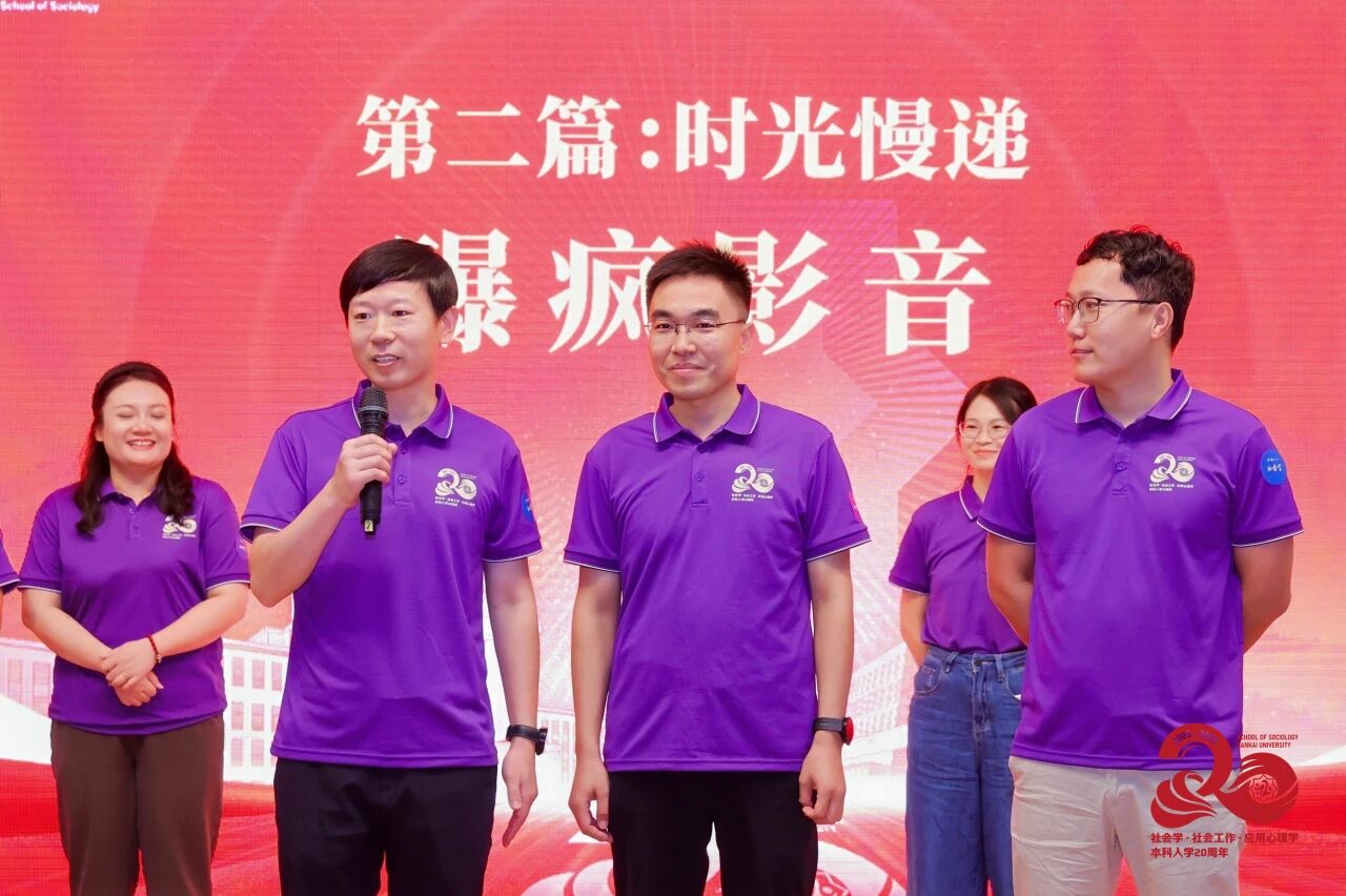 晚会特别邀请了当年三个系的系主任、班导师、任课教师、团委老师及辅导员莅临现场,与来自三个专业的员工共赴青春之约。员工们依次登台报出学号与姓名,熟悉的数字与名字在师生共同的应和中唤醒尘封的记忆,南开园的时光仿佛在这一刻倒流。