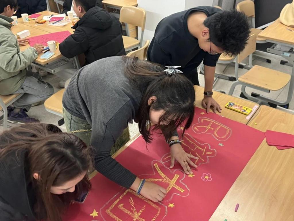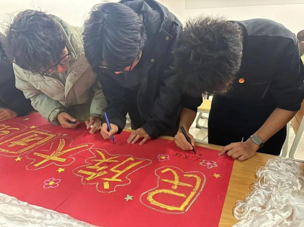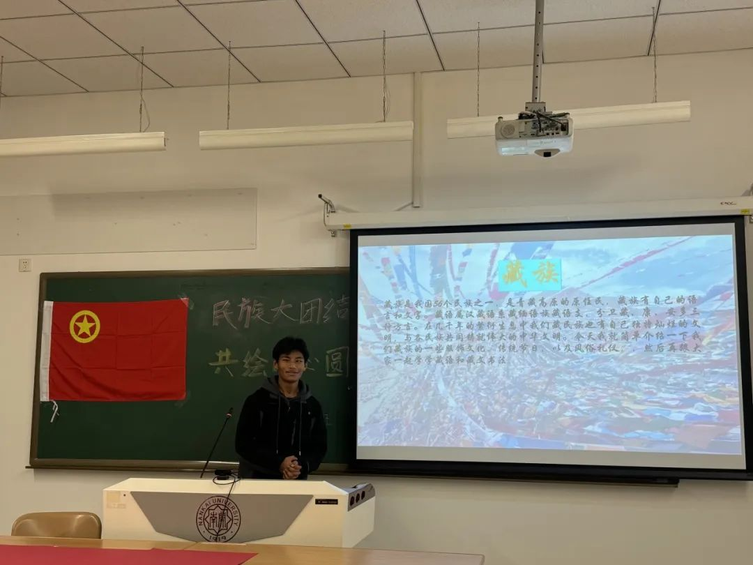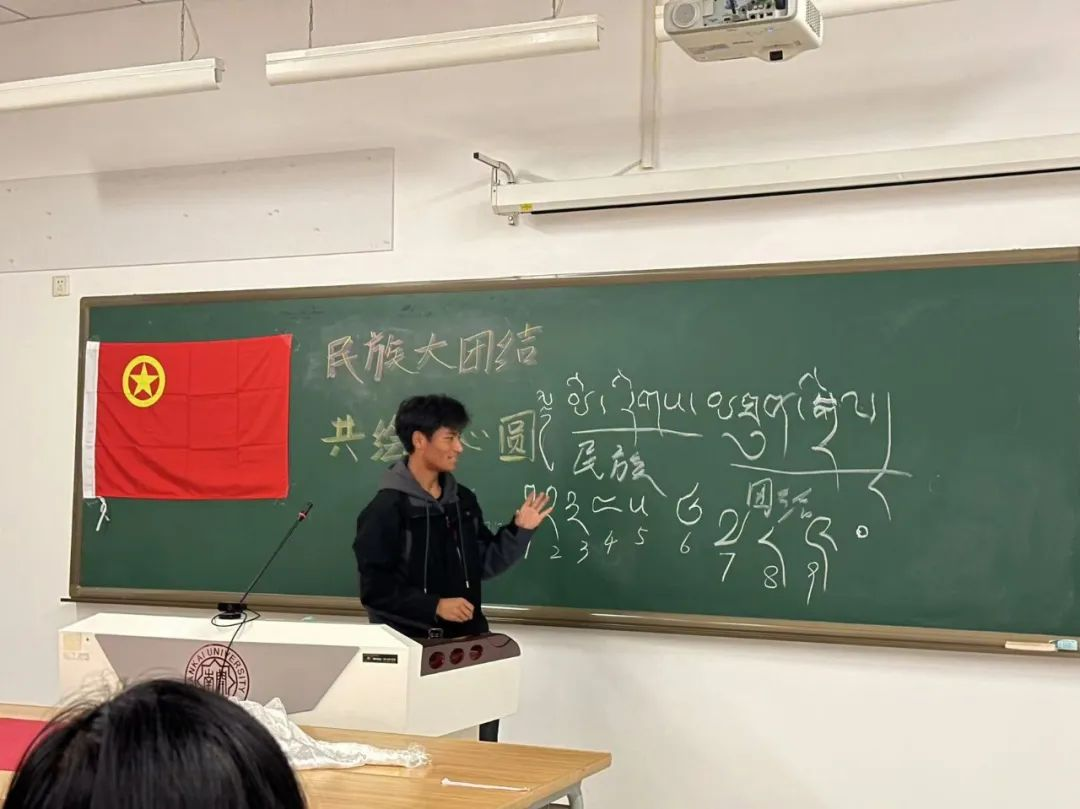 (来自藏族的同学教同学们写“民族团结”的藏语表达形式)